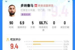 比赛中巴黎中后防多次出现走神、失误的情况,帕乔还送出了2次折射助攻,,可以说,这三粒丢球多纳鲁马毫无办法。