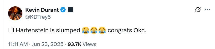 赛后前雷霆球员杜兰特更新社媒庆祝雷霆夺冠:“小哈滕睡着了哈哈,恭喜雷霆。”